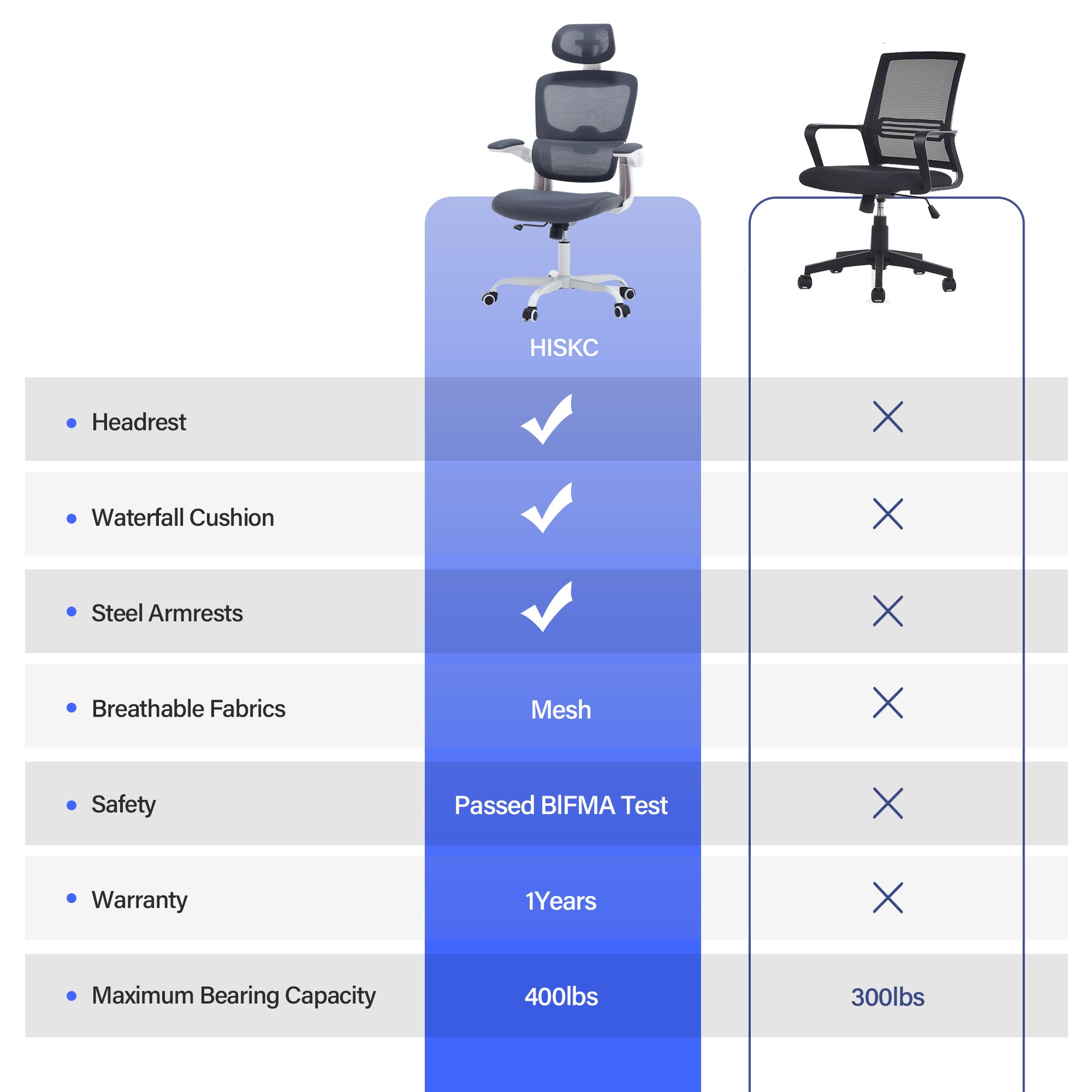 HISKC High Back Ergonomic Office Chair gives you bed-like comfort. The ergonomic chair provides 4 supporting points (head/ back/ lumbar/ hands) which creates total spinal support. Office chair easy to adjust seat height, headrest , armrest to meet different needs. The tilt function allows to tilt the backrest back automatically or sit straight freely. The mesh back and mesh seat keep air circulation for extra comfy. It also provides a simple and modern look, which will improve the appearance of your office. Fall into comfort on this ultra-padded swivel office chair that'll add personality to your home office or professional office space.