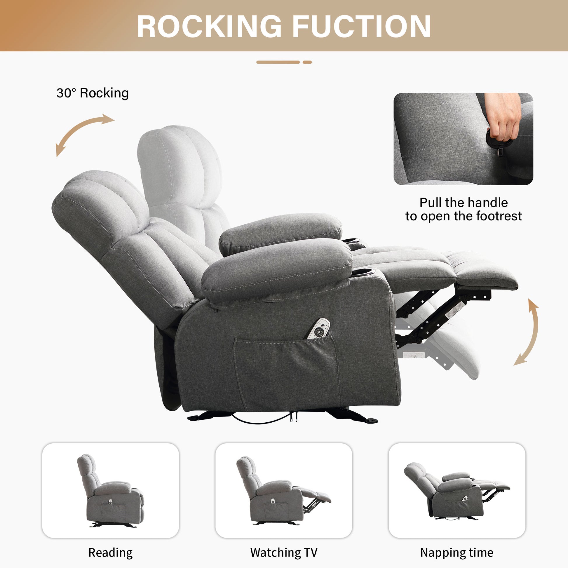 Whether reading a book, watching a movie, or taking a nap, a comfortable recliner chair can ease the stress of a busy day. Armrest for support and comfort with a high back, thick cushion, and high-grade antiskid upholstery, provide a very comfortable sitting feel and enhance safety. The 8 points massage and heat function offers you a full body massage at your home. 2 cup holders keep your thermos close at hand, and there are large side pockets for magazines and cell phones. Through a simple oblique pull device, you can adjust the angle you want, from 90° to 135° and the function allows you to fully stretch and relax, which is very suitable for watching TV, sleeping, and reading. JONPONY manual recliner sofa chair is modern and is ideal for being placed in various places such as the living room, bedroom, lounge room, study room, office, nursery, etc.